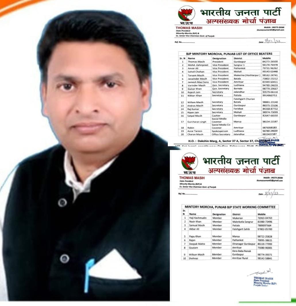 चंडीगढ़: 12 फरवरी (डीडी न्यूजपेपर),भारतीय जनता पार्टी पंजाब के प्रदेश अध्यक्ष अश्वनी शर्मा तथा संगठन महामंत्री श्रीमंथरी श्रीनिवासुलू से विचार-विमर्श के बाद भाजपा अल्पसंख्यक मोर्चा पंजाब के प्रदेश अध्यक्ष थॉमस मसीह द्वारा अपनी नई प्रादेशिक टीम तथा प्रदेश कार्यकारी सदस्यों की घोषणा कर दी गई है।