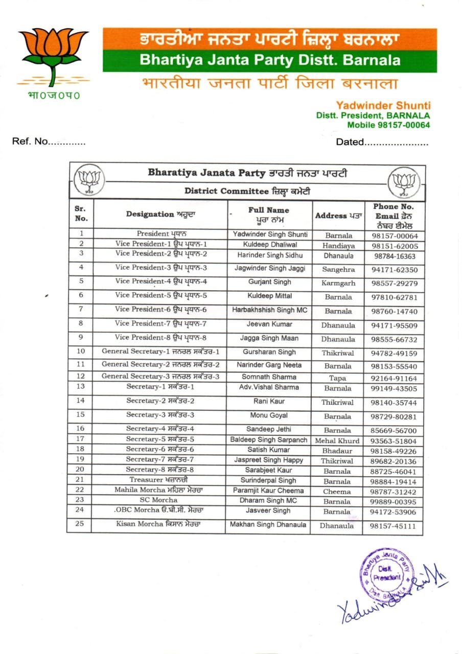 ਭਾਜਪਾ ਨੇ ਜ਼ਿਲ੍ਹਾ ਕਮੇਟੀ ਦੀ ਜਾਰੀ ਸੂਚੀ `ਚ ਸ਼ਹਿਣੇ ਨੂੰ ਕੀਤਾ ਅਣਗੌਲਿਆ
