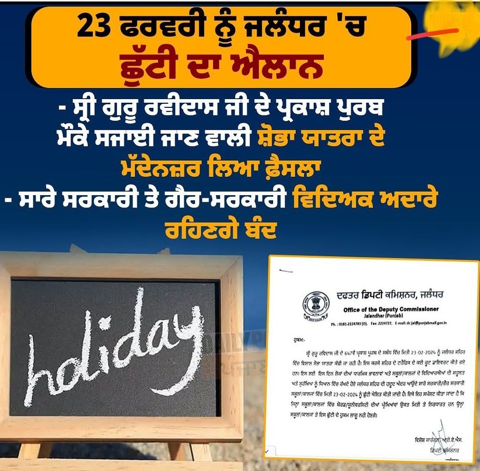 Breaking NEWSGeneralJalandharLatest newsLatest update NewsNewsPunjabSchool newsTechnologyTop NewsTOP STORIESTrendingVillage NEWS ਜਲੰਧਰ ਵਿੱਚ ਇਸ ਦਿਨ ਸਰਕਾਰੀ ਤੇ ਗੈਰ ਸਰਕਾਰੀ ਵਿਦਿਅਕ ਅਦਾਰੇ ਬੰਦ ਪੜੋ ਪੂਰੀ ਜਾਣਕਾਰੀ February 21, 2024 chief editor Spread the Newsਜਲੰਧਰ 21/ਫਰਬਰੀ, ਡੀਡੀ ਨਿਊਜ਼ਪੇਪਰ ਜਲੰਧਰ ਦੇ ਵਿੱਚ 23 ਤਾਰੀਕ ਨੂੰ ਛੁੱਟੀ ਦਾ ਐਲਾਨ ਸ਼੍ਰੀ ਗੁਰੂ ਰਵਿਦਾਸ ਮਹਾਰਾਜ ਜੀ ਦੇ ਪ੍ਰਕਾਸ਼ ਪੁਰਬ ਮੌਕੇ ਤੇ ਸਜਾਈ ਜਾਣ ਵਾਲੀ ਸ਼ੋਭਾ ਯਾਤਰਾ ਦੇ ਮੱਦੇਨਜ਼ਰ ਲਿਆ ਗਿਆ ਫ਼ੈਸਲਾ ਸਾਰੇ ਸਰਕਾਰੀ ਤੇ ਗੈਰ ਸਰਕਾਰੀ ਵਿਦਿਅਕ ਅਦਾਰੇ ਬੰਦ ਰਹਿਣਗੇ।