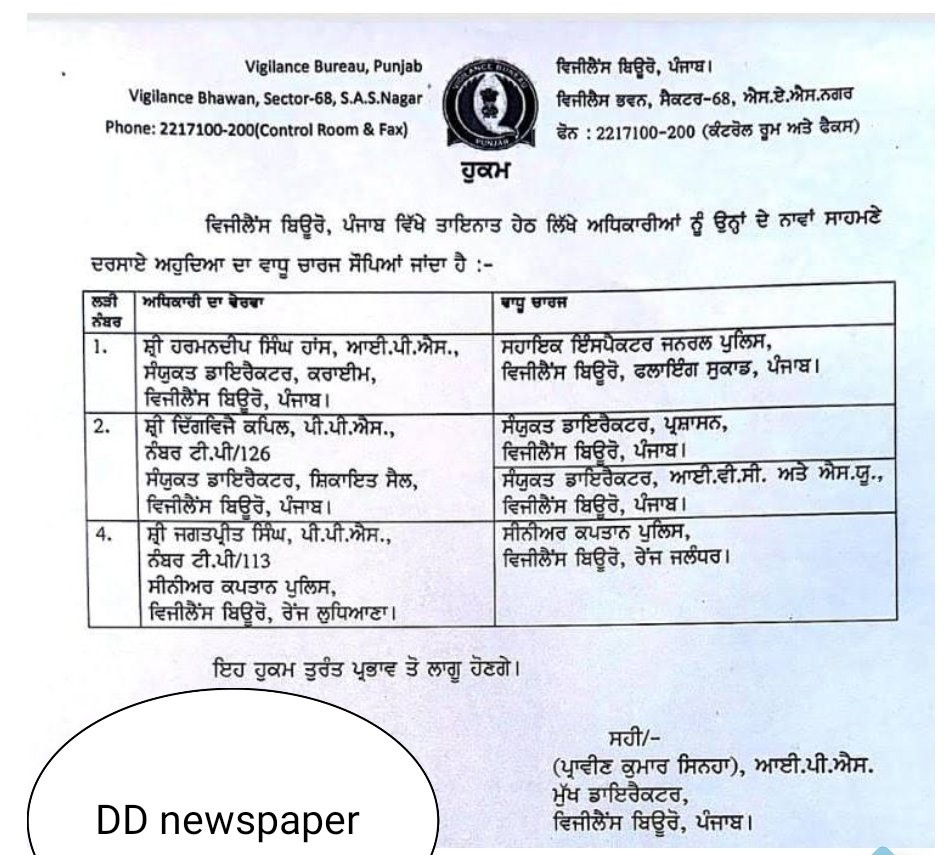 Breaking NEWSBreaking News PUNJABChandigarhGeneralLatest update NewsLatest Update NewsNewsPoliticsPunjabSocial mediaTechnologyTop NewsTrending ਮਾਨ ਸਰਕਾਰ ਵਲੋਂ 3 IPS ਤੇ PPS ਅਫ਼ਸਰਾਂ ਨੂੰ ਦਿੱਤੀ ਵੱਡੀ ਤੇ ਅਹਿਮ ਜਿੰਮੇਵਾਰੀ, ਪੜ੍ਹੋ ਵੇਰਵਾ April 27, 2025 chief editor Spread the Newsਡੀਡੀ ਨਿਊਜ ਪੇਪਰ , April 27, 2025 ਚੰਡੀਗੜ੍ਹ, ਪੰਜਾਬ ਸਰਕਾਰ ਨੇ ਵਿਜੀਲੈਂਸ ਬਿਊਰੋ ਵਿੱਚ ਤੈਨਾਤ 3 ਆਈਪੀਐਸ ਅਤੇ ਪੀਪੀਐਸ ਅਫ਼ਸਰਾਂ ਨੂੰ ਅਹਿਮ ਜਿੰਮੇਵਾਰੀ ਸੌਂਪੀ ਗਈ ਹੈ।