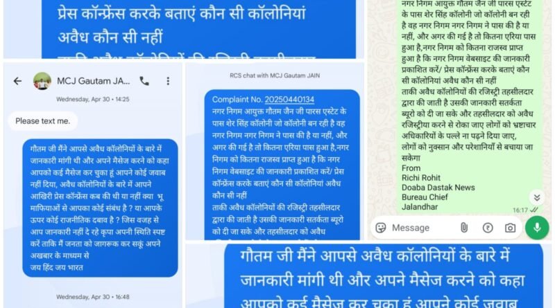 29/मई (डीडी न्यूजपेपर) . जालंधर निगम आयुक्त गौतम जैन से अवैध कॉलोनियों की जानकारी मांगी गई थी 25 अप्रैल 2025 को उनको व्हाट्सएप पर मैसेज किया गया. फ़ोन करने पर टेक्स्ट संदेश भेजने को कहा उनको कई टेक्स्ट मैसेज भेज गए कई फोन कॉल किए गए लेकिन अवैध कॉलोनियों के बारे में कालोनियों के बारे में जानकारी नहीं दी. गौतम जैन की इसमें क्या मजबूरी होगी ? सुखदेव विशिष्ट का नाम रोज अखबारों में इस प्रकार लिया जा रहा है जैसे कि वह घोटाला करता चला गया और प्रशासन ने आंखें बंद रखीं.क्या तत्कालिक आयुक्त गौतम जैन से इस बारे में सतर्कता विभाग ने पूछताछ की ? क्या किसी संयुक्त आयुक्त से पूछाताछ हुई या पुराने जो आयुक्त रहे हैं उनसे घोटाले के बारे में कुछ पूछा गया. प्रशासन का काम लोगों को जागरूक करना है उनको जानकारी देना है ना कि जानकारी छिपाना. क्या गौतम जैन का कोई भूमाफिया से कोई संबंध है ? अन्यथा उन्हें अवैध कोलोनियॉ के बारे में जानकारी देने में क्या आपत्ति है गाइडलाइन के मुताबिक उनको अपनी वेबसाइट पर डालना चाहिए कि किन कॉलोनाइजरों को लाइसेंस किसने कितनी फीस जमा करवाई. इसलिए अवैध कॉलोनियों के बारे में लोग जान ले और अपने पैसे ना फ़साये.पर हालात को देखते हुए ये कहा जा सकता है प्रशसन की मदद से ही अवैध कॉलोनियां बन रही है.