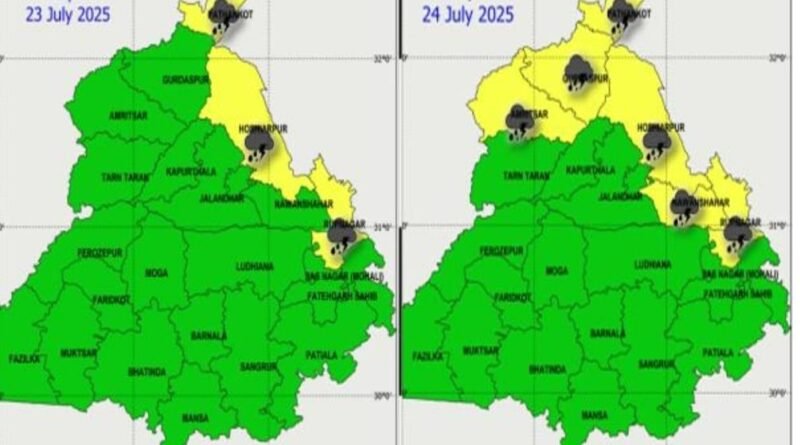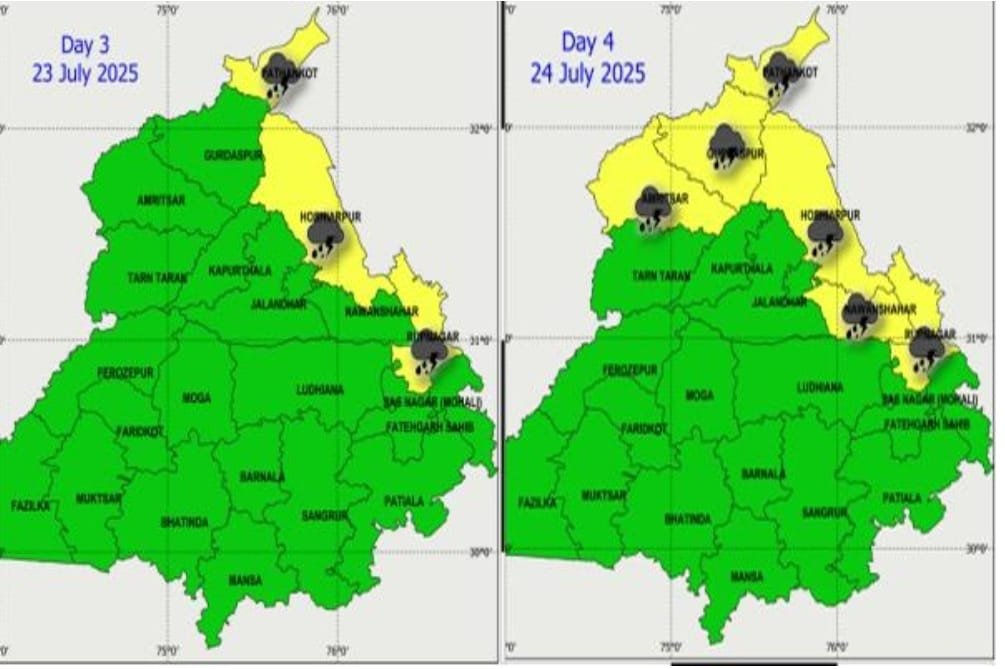 चंडीगढ़:21/जुलाई ,पंजाब में भीषण गर्मी के बीच मानसून की बारिश से लोगों को गर्मी से राहत मिली है। मौसम विभाग ने अगले कुछ दिनों तक भी भारी बारिश की चेतावनी जारी की है। मौसम विभाग ने 22, 23 और 24 तारीख को राज्य के कई जिलों में भारी बारिश की चेतावनी जारी की है। 22 तारीख यानी आज पठानकोट, होशियारपुर, फतेहगढ़ साहिब, रूपनगर, एस.ए.एस. नगर, कपूरथला, जालंधर, लुधियाना, पटियाला, नवांशहर और तरनतारन में भारी बारिश का येलो अलर्ट जारी किया गया है।heavy rain warning in punjab on 22nd 23rd 24th इन जिलों के लोगों को भारी बारिश के कारण परेशानी का सामना करना पड़ सकता है और यहां हालात और बिगड़ सकते हैं। इसके साथ ही, 23 तारीख को पठानकोट, होशियारपुर और रूपनगर में भारी बारिश का अनुमान है। इसलिए, इन जिलों के लोगों को उक्त तिथियों के लिए सावधानी बरतने को कहा गया है ताकि उन्हें किसी भी तरह की परेशानी का सामना न करना पड़े।अगर तापमान की बात करें तो औसतन अधिकतम तापमान में 0.6 डिग्री सेल्सियस की कमी दर्ज की गई है। पंजाब में सबसे ज़्यादा तापमान पटियाला में 35.4 डिग्री सेल्सियस दर्ज किया गया। लुधियाना में 35, बठिंडा में 35.4, अमृतसर में 34.2, पठानकोट में 32.7 और फिरोजपुर में 33 डिग्री सेल्सियस तापमान दर्ज किया गया। इसके अलावा, फिरोजपुर में 2.5 मिमी. और पठानकोट में हल्की बारिश दर्ज की गई।