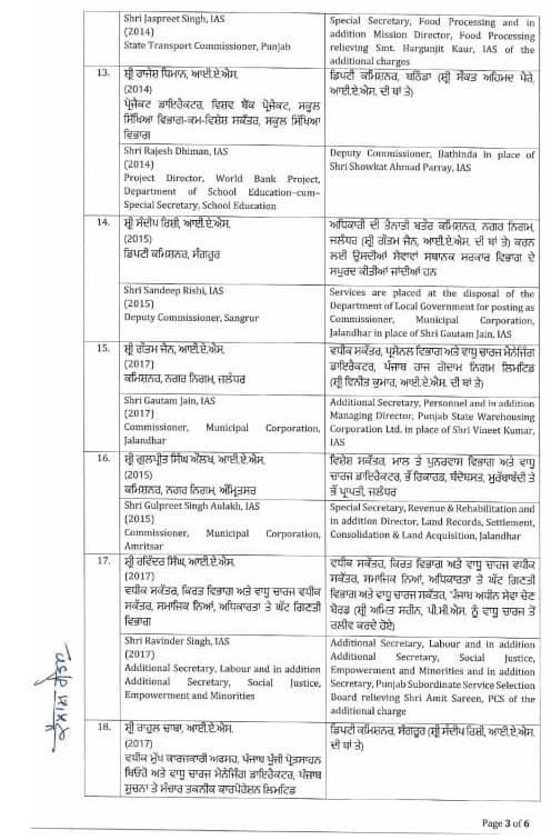 डीडी न्यूजपेपर, 20/अगस्त ,चंडीगढ़/जालंधर। Transfers Posting News Punjab : पंजाब सरकार (Punjab Government) ने ब्यूरोक्रेसी में बड़ा बदलाव किया है। सरकार ने जालंधर नगर निगम के कमिश्नर गौतम जैन कुछ दिन पहले ही हमने खबर प्रकाशित की थी कि इनसे जालंधर की नाजायज कॉलोनी की लिस्ट मांगी थी जिसकी शिकायत हमने लोकल बॉडी मिनिस्टर तेजवीर सिंह जी को भी की थी (gautam Jain IAS) समेत कई जिलों के डीसी और नगर निगमों के कमिश्नरों को तबादला कर दिया। कुल 31 अफसरों का तबादला पंजाब (Punjab) सरकार ने जालंधर नगर निगम (Jalandhar Municipal Corporation) के कमिश्नर गौतम जैन को चंडीगढ़ भेज दिया है। उनकी जगह सगंरूर के डीसी संगरूर को जालंधर निगम का कमिश्नर तैनात किया है। इसके साथ कई पीसीएस अफसरों का भी तबादला हुआ है।