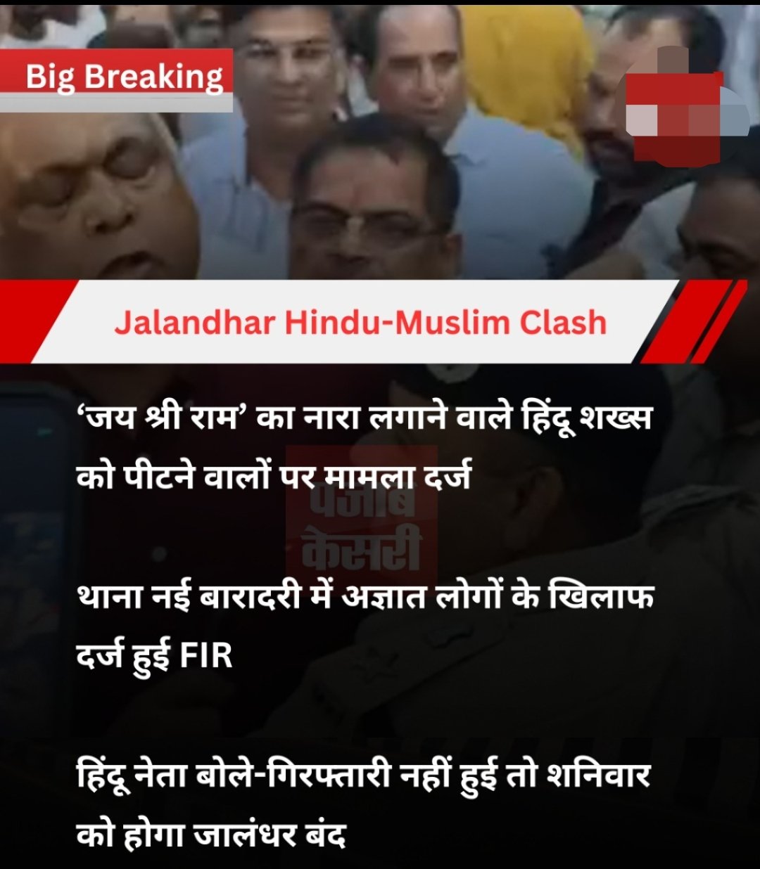 जालंधर 3,अक्टूबर आज डीसी कांप्लेक्स के बाहर मुस्लिम समाज द्वारा रोष प्रदर्शन करके धार्मिक नारे लगाए जा रहे थे वहां से गुजर रहे एक लड़के ने प्रभु श्री राम का नारा लगा दिया जिसको लेकर वहां पर उपस्थित सभी मुसलमान समाज के लोगों ने उसकी पिटाई करनी शुरू कर दी और सारी भीड़ ने उसको पकड़ कर बुरी तरह से पीटना शुरू किया जिस पर वहां खड़े कुछ लोगों ने बीच बचाव कर उसे लड़के की जान बचाई भाजपा महामंत्री अशोक सरीन हिकी ने बताया कि यह पंजाब में पहली बार हुआ है और यह घटना बहुत ही दुखदाई है उन्होंने कहा कि कल समूह हिंदू समाज 4 अक्टूबर दिन शनिवार को सुबह 11:00 बजे इस नींददनीय और दुखदाई घटना के रोष स्वरूप कंपनी बाग प्रभु श्री राम चौक पर धरना देगा और अगर फिर भी प्रशासन ने दोषियों के खिलाफ कोई कार्रवाई न की तो उसकी सारी जिम्मेदारी पंजाब सरकार पर होगी