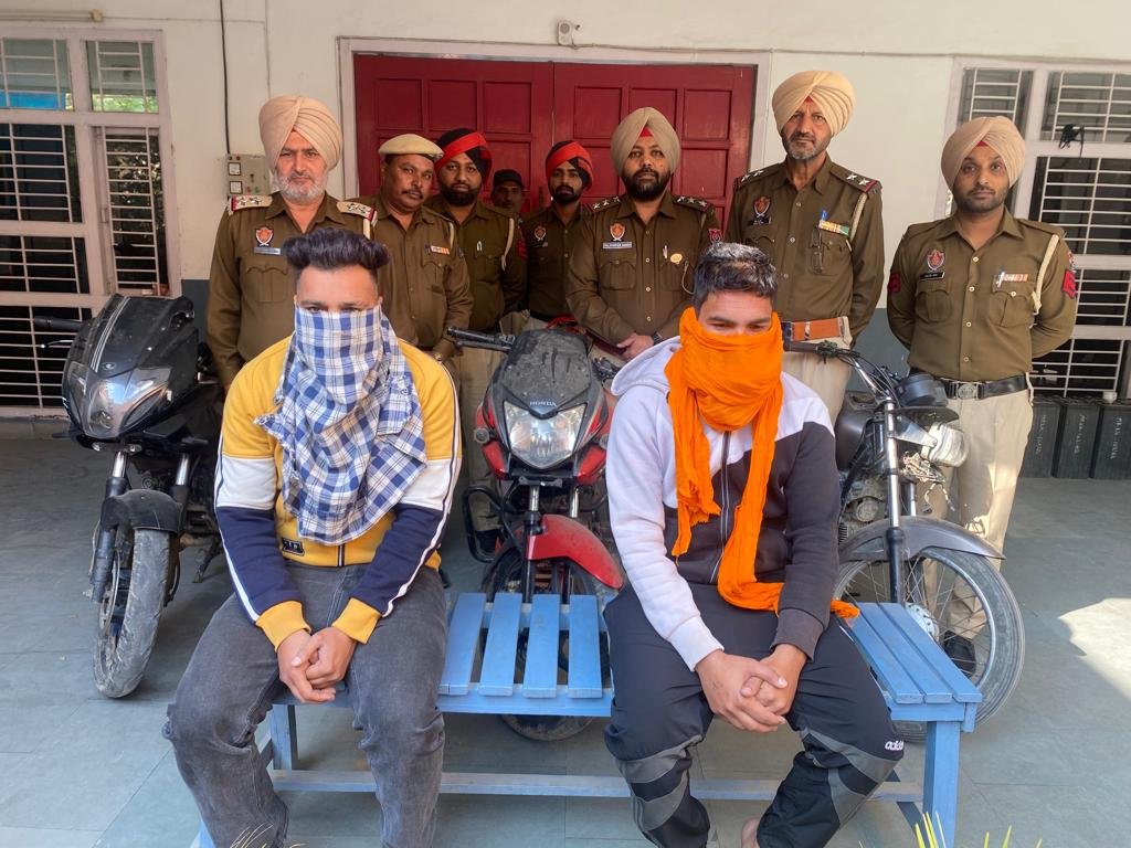 ਸ੍ਰੀ ਸਵਰਨਦੀਪ ਸਿੰਘ ਪੀ.ਪੀ.ਐੱਸ ਸੀਨੀਅਰ ਪੁਲਿਸ ਕਪਤਾਨ, ਜਲੰਧਰ ਦਿਹਾਤੀ ਜੀ ਦੇ ਦਿਸ਼ਾ ਨਿਰਦੇਸ਼ ਅਨੁਸਾਰ ਨਸ਼ਾ ਤਸਕਰਾਂ/ਲੁੱਟਾ ਖੋਹਾ ਕਰਨ ਵਾਲੇ ਵਿਰੁੱਧ ਚਲਾਈ ਗਈ ਵਿਸ਼ੇਸ਼ ਮੁਹਿੰਮ ਤਹਿਤ, ਸ਼੍ਰੀ ਸਰਬਜੀਤ ਸਿੰਘ ਬਾਹੀਆ ਪੀ.ਪੀ.ਐੱਸ, ਪੁਲਿਸ ਕਪਤਾਨ, ਇੰਨਵੈਸਟੀਗੇਸ਼ਨ ਜਲੰਧਰ ਦਿਹਾਤੀ ਅਤੇ ਸ਼੍ਰੀ ਹਰਜਿੰਦਰ ਸਿੰਘ ਉਪ- ਪੁਲਿਸ ਕਪਤਾਨ, ਸਬ-ਡਵੀਜ਼ਨ ਨਕੋਦਰ ਦੀ ਅਗਵਾਈ ਹੇਠ ਇੰਸਪੈਕਟਰ ਪਲਵਿੰਦਰ ਸਿੰਘ ਮੁੱਖ ਅਫਸਰ ਥਾਣਾ ਸਦਰ ਨਕੋਦਰ ਜਿਲ੍ਹਾ ਜਲੰਧਰ ਥਾਣਾ ਸਦਰ ਨਕੋਦਰ ਦੀ ਪੁਲਿਸ ਵੱਲੋ ਲੁੱਟਾਂ ਖੋਹਾਂ ਕਰਨ ਵਾਲੇ ਗਿਰੋਹ ਦੇ 02 ਮੈਬਰਾਂ ਨੂੰ ਗ੍ਰਿਫਤਾਰ ਕਰਕੇ ਉਹਨਾ ਪਾਸੋ ਤਿੰਨ ਮੋਟਰ ਸਾਈਕਲ ਬਿਨਾ ਨੰਬਰੀ ਅਤੇ ਮਾਰੂ ਹਥਿਆਰ ਸਮੇਤ ਕੀਤਾ ਕਾਬੂ। ਇਸ ਸਬੰਧੀ ਪ੍ਰੈਸ ਨੂੰ ਜਾਣਕਾਰੀ ਦਿੰਦੇ ਹੋਏ ਸ੍ਰੀ ਹਰਜਿੰਦਰ ਸਿੰਘ ਉਪ-ਪੁਲਿਸ ਕਪਤਾਨ, ਸਬ- ਡਵੀਜਨ ਨਕੋਦਰ ਜੀ ਨੇ ਦੱਸਿਆ ਕਿ ਮਿਤੀ 26-11-2022 ਨੂੰ $1 ਜਸਵੀਰ ਸਿੰਘ ਥਾਣਾ ਸਦਰ ਨਕੋਦਰ ਜਿਲ੍ਹਾ ਜਲੰਧਰ ਦਿਹਾਤੀ ਨੇ ਸਮੇਤ ਪੁਲਿਸ ਪਾਰਟੀ ਮੇਨ ਗੇਟ ਪਿੰਡ ਮੁੱਧ ਜੀ.ਟੀ ਰੋਡ ਪਰ ਨਾਕਾਬੰਦੀ ਕੀਤੀ ਹੋਈ ਸੀ ਕਿ ਮੁਖਬਰ ਖਾਸ ਦੀ ਇਤਲਾਹ ਪਰ ਪਿੰਡ ਸਹਿਮ ਵੱਲ ਨੂੰ ਜਾਂਦੇ ਹੋਏ ਰਾਸਤੇ ਵਿਚ ਬਣੇ ਸ਼ਮਸ਼ਾਨ ਘਾਟ ਵਿਚੋਂ ਜੀ.ਟੀ ਰੋਡ ਜਲੰਧਰ-ਸ਼ਾਹਕੋਟ ਪਰ ਲੁੱਟਾਂ ਖੋਹਾਂ ਕਰਨ ਵਾਲੇ ਗਿਰੋਹ ਦੇ ਦੋ ਮੈਂਬਰ ਅਮਨਦੀਪ ਸਿੰਘ @ ਅਮਨਾ ਪੁੱਤਰ ਸੁਖਚੈਨ ਸਿੰਘ ਵਾਸੀ ਮੁਹੱਲਾ ਗਾੜਿਆ ਥਾਣਾ ਸਿਟੀ ਨਕੋਦਰ ਜਿਲ੍ਹਾ ਜਲੰਧਰ ਅਤੇ ਸੁਖਜੀਵਨ ਸਿੰਘ (@ ਜੀਵਨ ਪੁੱਤਰ ਦੇਸ ਰਾਜ ਵਾਸੀ ਮੀਰਾਪੁਰ ਥਾਣਾ ਸਿਟੀ ਨਕੋਦਰ ਜਿਲ੍ਹਾ ਜਲੰਧਰ ਨੂੰ ਕਾਬੂ ਕਰਕੇ ਇਹਨਾਂ ਪਾਸੋਂ ਤਿੰਨ ਖੋਹ ਕੀਤੇ ਮੋਟਰ ਸਾਈਕਲ ਪਲਸਰ ਮਾਰਕਾ ਬਜਾਜ ਰੰਗ ਕਾਲਾ, ਸਟਨਰ ਮਾਰਕਾ ਹਾਂਡਾ ਰੰਗ ਲਾਲ, ਸਪਲੈਂਡਰ ਮਾਰਕਾ ਹੀਰੋ ਹਾਂਡਾ ਰੰਗ ਕਾਲਾ ਤਿੰਨੋ ਬਿਨਾਂ ਨੰਬਰੀ ਅਤੇ ਮਾਰੂ ਹਥਿਆਰ (ਖੰਡਾ,ਕਿਰਪਾਨ ਤੇ ਲੋਹੇ ਦਾ ਪਾਈਪ) ਬ੍ਰਾਮਦ ਕਰਕੇ ਦੋਸ਼ੀਆ ਦੇ ਖਿਲਾਫ ਮੁਕੱਦਮਾ ਨੰਬਰ 185 ਮਿਤੀ 26-11-2022 ਅ/ਧ 379-B,34,411 IPC ਥਾਣਾ ਸਦਰ ਨਕੋਦਰ ਜਿਲ੍ਹਾ ਜਲੰਧਰ ਦਰਜ ਰਜਿਸਟਰ ਕਰਕੇ ਤਫਤੀਸ਼ ਅਮਲ ਵਿੱਚ ਲਿਆਦੀ ਗਈ।ਦੋਸ਼ੀਆ ਪਾਸੋਂ ਡੂੰਘਾਈ ਨਾਲ ਪੁਛਗਿੱਛ ਕੀਤੀ ਜਾ ਰਹੀ ਅਤੇ ਹੋਰ ਵੀ ਖੁਲਾਸੇ ਹੋਣ ਦੀ ਸੰਭਾਵਨਾ ਹੈ।